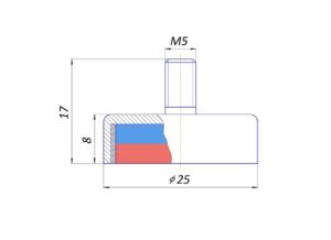 El imán se coloca en una carcasa de acero que se fija a un adhesivo epoxi. Esto permite que el campo magnético se transfiera parcialmente a la superficie de trabajo, lo que aumenta la fuerza de desprendimiento del imán en comparación con un imán de arandela convencional.